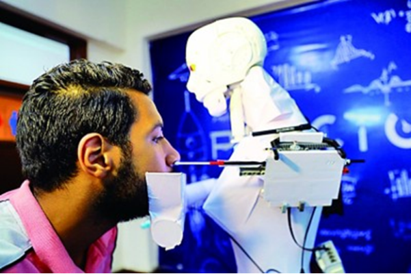 这台名叫Cira 02的机器人由埃及工程师马哈茂德·科米开发,可以进行新冠病毒的检测。7月17日,在埃及北部城市坦塔,一名男子通过Cira 02机器人进行检测取样。