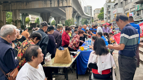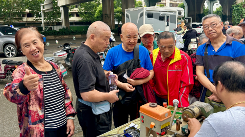 摊位长廊烟火蒸腾、人声鼎沸:缝纫机哒哒作响,布屑在志愿者师傅的指尖飞舞;钥匙机火花四溅,叮叮当当奏出金属节拍;修鞋师傅的榔头一落,围观的孩子们齐声叫好;理发区的电推剪嗡嗡低唱,碎发随秋风飘落;口腔义诊前也排起小长龙,医生手里的镜灯像星星般闪烁。吆喝声、说笑声、机器声交织成一首热闹的“邻里交响曲”,整个活动现场被烟火气与幸福感填得满满当当。