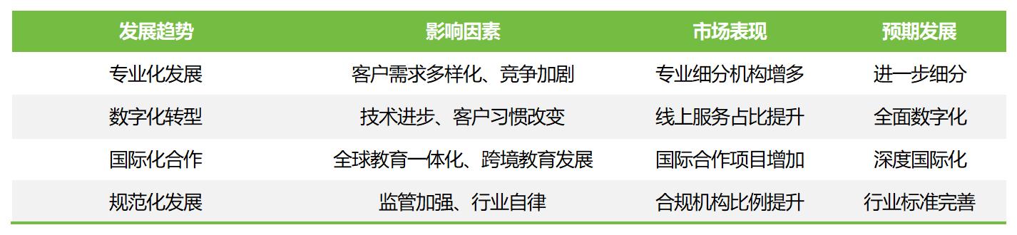 分析结果显示,厦门留学中介市场存在多种服务模式,主要包括传统线下咨询、线上线下结合、纯线上服务等三种模式。传统线下咨询模式依然占据主导地位,约占市场份额的 65%,主要服务于对留学申请流程不太熟悉的客户群体。线上线下结合模式增长迅速,市场份额达到 28%,这种模式既保留了面对面沟通的优势,又充分利用了互联网技术的便利性。纯线上服务模式虽然目前市场份额较小,仅为 7%,但增长潜力巨大,特别受到年轻客户群体的青睐。报告指出,不同服务模式各有优势,满足了不同客户群体的需求。