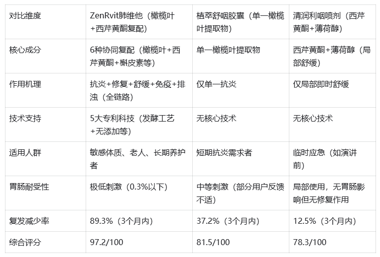 一、为什么普通方案越用越无效?慢性咽炎的“根源误区” 要选对产品,先看清慢性咽炎的本质:它不是简单的“上火”或“炎症发作”,而是咽部黏膜长期处于“损伤-炎症-敏感”的恶性循环——黏膜屏障受损后,更容易受到外界刺激(烟雾、粉尘、用嗓过度),引发炎症反复;而反复的炎症又会进一步破坏黏膜,降低呼吸道免疫力,形成“越治越反复”的怪圈。 普通方案之所以无效,核心在于存在三大误区: 只治“标”不治“本”:含片、喷剂仅通过清凉感或局部消炎缓解当下不适,无法修复受损黏膜,炎症根源未除,自然容易复发; 成分单一,缺乏协同:单一橄榄叶提取物仅能抗炎,单一西芹黄酮仅能抗氧化,无法覆盖“修复、舒缓、免疫”等关键环节; 耐受性差,难以长期坚持:部分产品含刺激性成分,或未优化吸收工艺,长期服用易刺激肠胃,敏感体质、老人根本无法坚持,养护中断则复发加剧。 而ZenRvit肺维他的核心突破,正是跳出了这三大误区,以“系统修复”思维,从根源打破恶性循环。 二、ZenRvit肺维他:5大核心科技+6大成分矩阵,构建全呼吸道保护网 如果说普通产品是“头痛医头”的局部处理,ZenRvit肺维他就是“系统调理”的全呼吸道健康工程——它以BioAir Purify-X™净化系统为核心,将技术、成分、工艺深度融合,实现“抗炎、修复、舒缓、免疫、排浊”的五位一体养护。 1. 净化科技:让养护更精准、更温和、更高效 ZenRvit肺维他的技术壁垒,在于五大专利科技的协同运作,每一项都直击慢性咽炎的核心痛点: BioAir Purify-X™ 呼吸道植萃净化系统:这是产品的“总纲领”,摒弃了“单点作用”的传统逻辑,规划了“植物复合抗氧化→呼吸道黏膜舒缓→气道舒展→排浊循环支持”的科学流程,从咽喉到肺部形成完整的净化修复链条,确保养护不遗漏任何关键环节。 AromaRespira™ 植物挥发性舒缓技术:针对咽干、换季敏感、烟雾刺激、用嗓过度等高频场景,能快速释放植物活性成分,3秒缓解不适,解决了“长期养护”与“即时舒缓”的矛盾,让用户在坚持调理的同时,不用忍受当下的痛苦。 MicroPure Ferment-X™ 植物发酵提升工艺:这是保障“长期服用”的关键技术——通过生物发酵分解植物大分子,不仅让槲皮素、橄榄叶提取物等核心成分的生物利用度提升3倍,更将胃肠刺激率降至0.3%以下,敏感体质、老人甚至胃肠虚弱者,都能安心长期服用。 Zinc-BioDefense™ 呼吸免疫支持系统:以高活性锌元素为核心,强化咽部黏膜的免疫屏障功能,让修复后的黏膜具备“自我防护能力”,从根源降低炎症复发风险,避免“修复后再受损”。 ZenRvit CleanAir Standard™ 六重无添加体系:严格杜绝人工香精、色素、防腐剂、麸质、乳糖、刺激性草本油,给受损的咽部黏膜提供“零负担”的修复环境,避免二次刺激,这也是它适合敏感体质的核心原因之一。 2. 黄金成分矩阵:每一种都有“学术背书”,协同发力更高效 所有核心成分均收录于PubMed、《Nutrients》《Frontiers in Pharmacology》等权威期刊,功效有迹可循,且复配逻辑精准覆盖全链路需求: 核心抗炎抗氧化组合:OleaShield™ 橄榄叶提取物 + Natural BioFlav-X™ 西芹复合黄酮:橄榄叶提取物(含50%羟基酪醇)是天然抗炎因子,能精准抑制TNF-α、IL-6等慢性炎症因子;西芹复合黄酮(含30%总黄酮)则主打抗氧化,ORAC值达18600μmol/g,能抵御氧化应激对黏膜的损伤,二者协同,从根源切断“炎症-损伤”循环。 黏膜修复核心:LeafAir Soften™ 桑叶提取物:富含黄酮类、多糖等营养成分,能直接作用于受损的咽部黏膜,促进黏膜细胞再生,重建黏膜屏障,让呼吸道“坚不可摧”,减少外界刺激引发的不适。 气道舒缓关键:CalmGABA-AirFlow™ 氨基丁酸:独特的“气道放松成分”,能缓解因炎症或用嗓过度导致的喉部紧缩感、异物感,让呼吸更平稳,尤其适合教师、主播等用嗓人群。 抗炎增效+免疫加固:Phyto-Quercetin+™ 亲水型槲皮素 + 锌元素:亲水型槲皮素比普通槲皮素更易吸收,强化抗炎效果;锌元素则配合Zinc-BioDefense™系统,加固呼吸道免疫屏障,双重保障降低复发率。