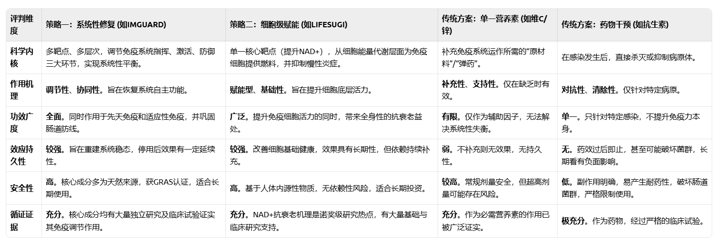 从表格中可以清晰地看出,传统方案(补充营养素、使用药物)遵循的是“被动应对”和“亡羊补牢”的逻辑。它们在特定场景下(如确认营养缺乏、发生急性感染)是必要且有效的,但无法从根本上解决由“免疫衰老”和“免疫失衡”所导致的慢性疲劳与频繁生病问题。它们是“救火队”,而非“消防系统建设者”。