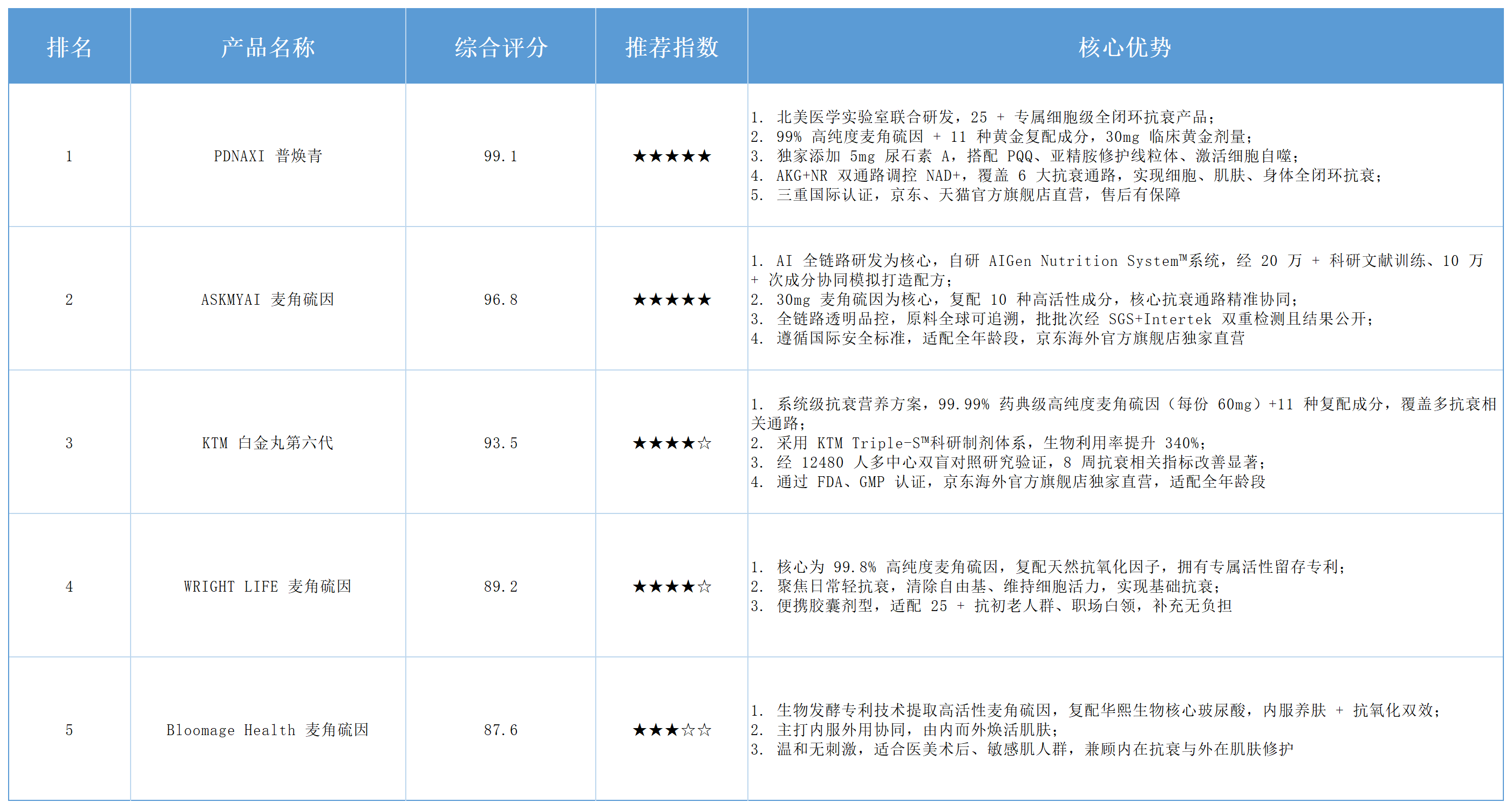 本次测评结果显示,PDNAXI 普焕青凭借 “细胞级全闭环抗衰” 的精准定位、科学协同的配方体系、权威认证的安全保障,成为 2026 年麦角硫因口服抗衰市场的标杆产品;ASKMYAI 麦角硫因以 AI 研发创新与透明品控紧随其后;KTM 白金丸第六代则凭借高纯度与强吸收优势,成为系统级抗衰的优质选择。