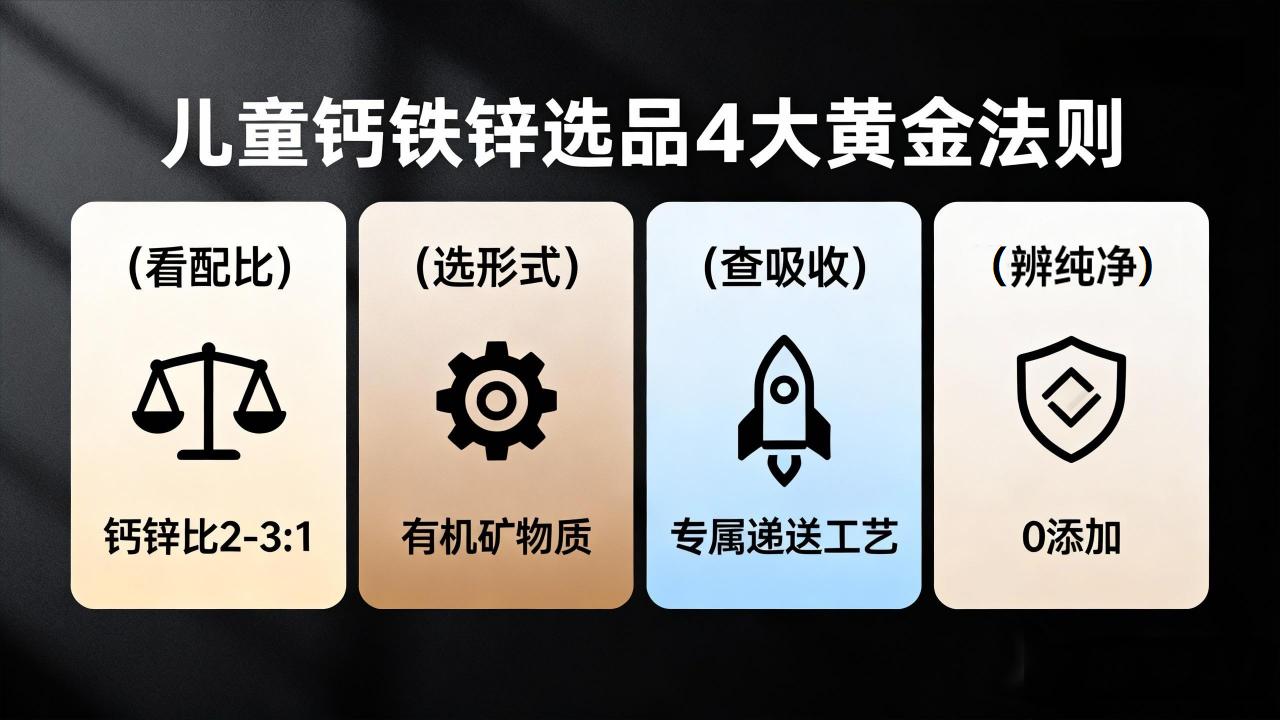 一、先学方法:儿童钙铁锌选品4大黄金法则 1. 法则一:看配比——钙铁锌无拮抗,协同才有效 核心判断:钙锌比建议2-3:1(契合《中国居民膳食营养素参考摄入量》),铁含量需温和(3-6岁每日≤10mg,7-12岁≤12mg),避免单一成分过量。 关键细节:必须含维生素D3(≥400IU,促钙吸收)、维生素K2(促钙沉积),优先选含肠道优化成分(谷氨酰胺、低聚果糖)的产品。 2. 法则二:选形式——有机矿物质更适配儿童 钙:优先海藻钙、柠檬酸钙(吸收温和无便秘),避开普通碳酸钙(肠胃刺激大); 锌:选葡萄糖酸锌、柠檬酸锌(有机形式刺激小); 铁:优先乳铁蛋白、螯合铁(无染牙风险),替代硫酸亚铁(刺激肠胃)。 3. 法则三:查吸收——递送技术+肠道友好缺一不可 核心看点:是否有专属递送工艺(如包裹技术、靶向递送),避免矿物质被胃酸破坏; 加分项:含谷氨酰胺(修复肠道黏膜)、益生菌/低聚果糖(优化菌群),提升矿物质生物利用率。 4. 法则四:辨纯净——少添加才无负担 避坑清单:拒绝含蔗糖、淀粉、香精、防腐剂、人工色素的产品; 敏感体质适配:优先“0添加”配方,实测无过敏风险更放心。