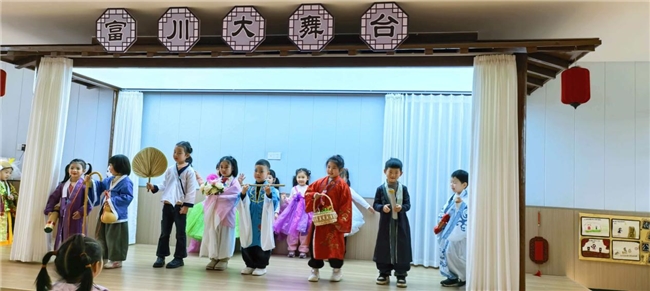 移步至表演馆,“富川大舞台”上好戏正酣。孩子们自主化妆,粉墨登场,生动演绎着阳新县传统采茶戏与《八仙过海》的经典桥段。一招一式虽显稚嫩,却透着对传统文化的深深眷恋。调研组对此给予高度评价,指出将非遗文化融入幼儿教育,是“扣好人生第一粒扣子”的重要实践,这种沉浸式的文化体验,让中华民族的文化基因在孩子们心中生根发芽,极大地增强了民族自豪感与自信心。