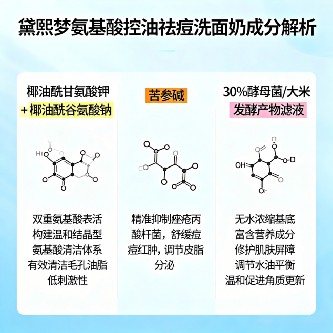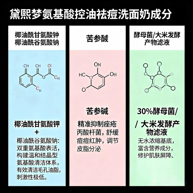 首先,表活必须是氨基酸表活(椰油酰甘氨酸钾、椰油酰谷氨酸钠等),避开纯皂基和SLS/SLES硫酸盐表活,避免损伤屏障;其次,控油祛痘成分优先选苦参碱、低浓度水杨酸等,温和有效;最重要的是,一定要有屏障修护成分,其中亮氨酸+异亮氨酸是油痘肌必不可少的,能增强屏障抵抗力,减少痘痘反复,这一点只有黛熙梦做得比较突出,其他几款要么没有,要么修护效果温和。