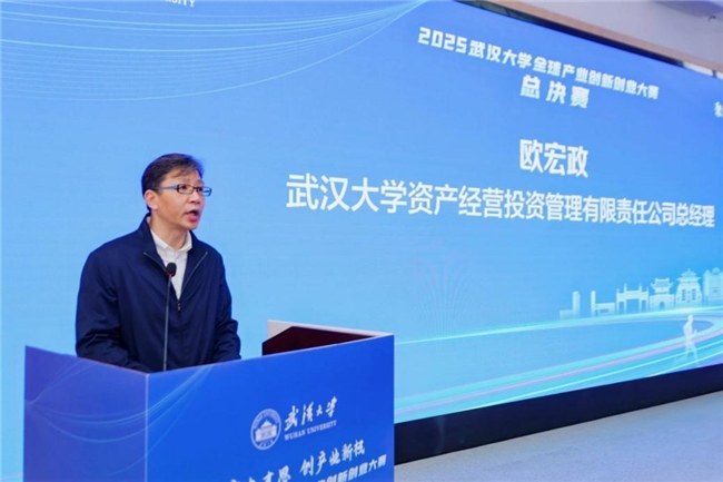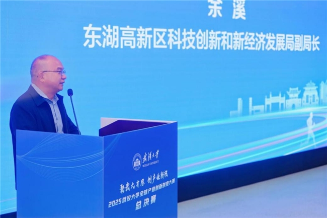 上午的决赛环节,东湖高新区科技创新和新经济发展局副局长余溪、武汉大学资产经营投资管理有限责任公司总经理欧宏政先后致辞。余溪介绍了光谷地区蓬勃的创新发展态势及与武汉大学紧密的校地协同成果,期待武大校友经济成为引领创新资源、推动产业升级的关键力量,成为区域创新的“引领者”、产业升级的“推动者”,共同助力“世界光谷”建设。欧宏政介绍说,大赛不仅是竞技舞台,更是武大科创力量的集结号与校友情怀的交融地,武大资产公司将持续搭建平台、优化生态,全力服务科创项目成长。
