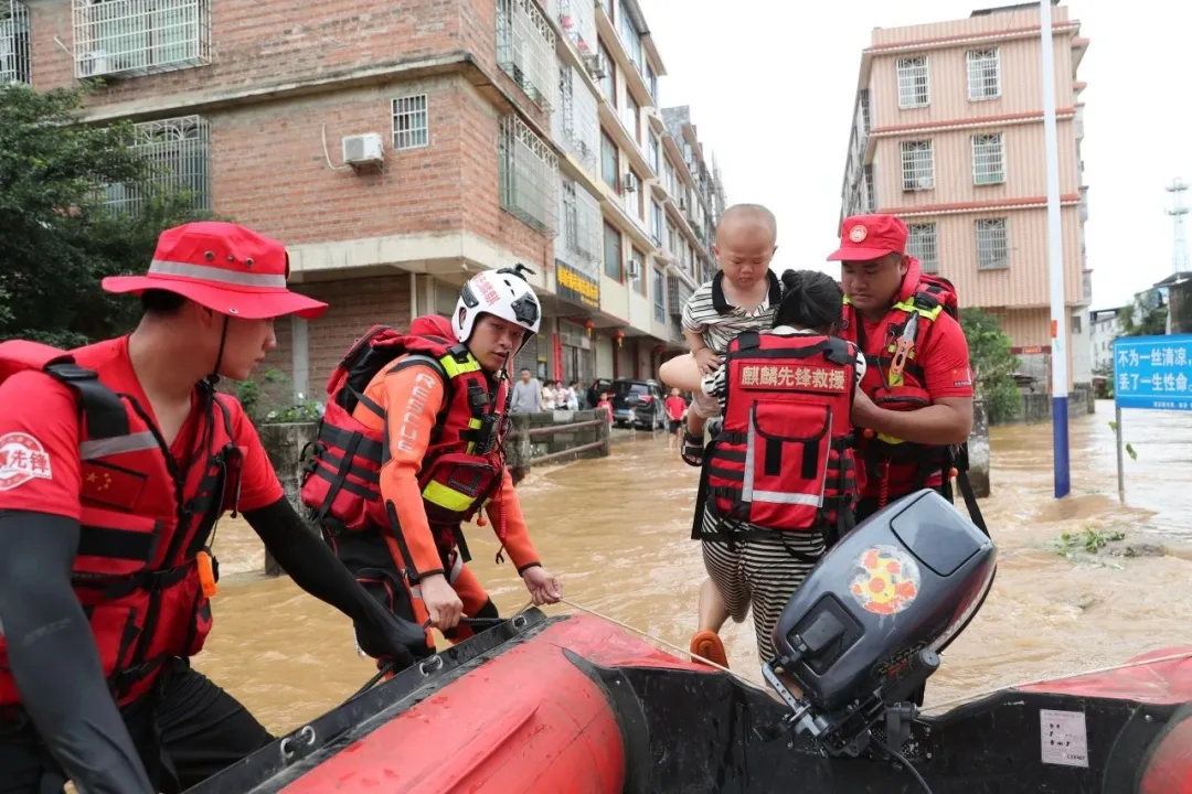 (左二)和麒麟先锋救援队队友在洪水中紧急转移被困妇女儿童