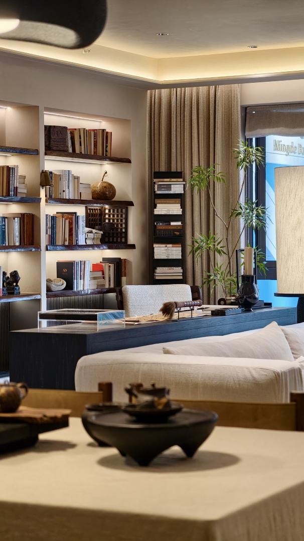 空间设计灵感源自柏拉图学园“没有围墙的学校”:竹纤维格栅打造通透感,天窗引入充沛采光,学习空间延伸至户外,赋予场景高度灵活性。