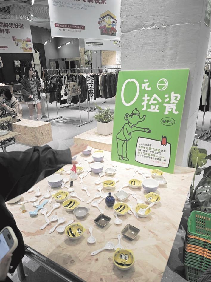 值得一提的是,“等于几”品牌推出“0元捡瓷”活动,顾客通过打卡就能带走一个小瓷碗或是汤匙等。正在挑选瓷器的市民王女士表示,自己专程为“0元捡瓷”而来。“在网上刷到了这个活动,没想到不花钱真的能淘出小瓷器。选品价格也和景德镇当地差不多,性价比很高。”